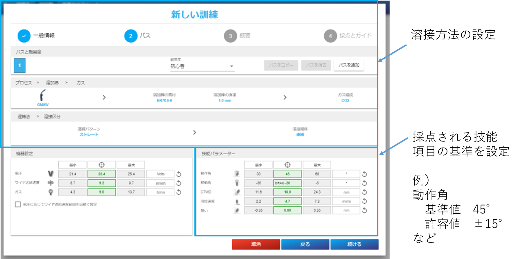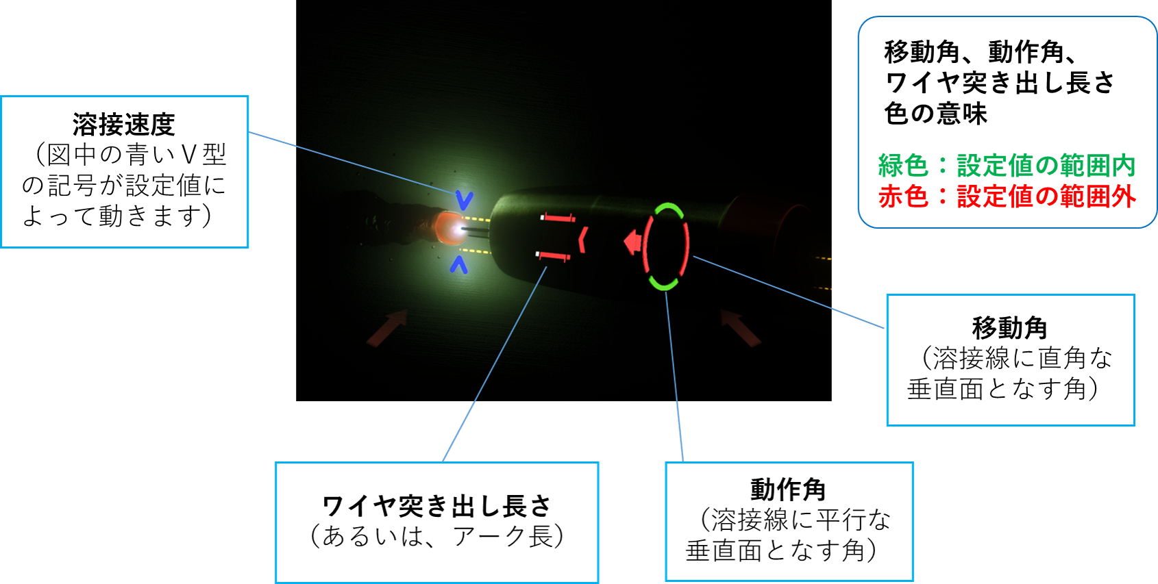 * 正しい値とは、実際の溶接で品質が担保できる運棒方法の値を指します。運棒方法のガイドは、次の5つとなります。1)移動角(溶接方向のトーチ角度)、2)動作角(溶接方向と鉛直方向のトーチ角度)、3)溶接速度、4)溶接ワイヤの突き出し長さ(もしくは、アーク長)、5)溶接ワイヤ(溶接棒/タングステン)の狙い位置。これらの値については、お客様がお持ちのデータをそのまま反映させることができます(下記、溶接課題の作成の図をご参照ください)。