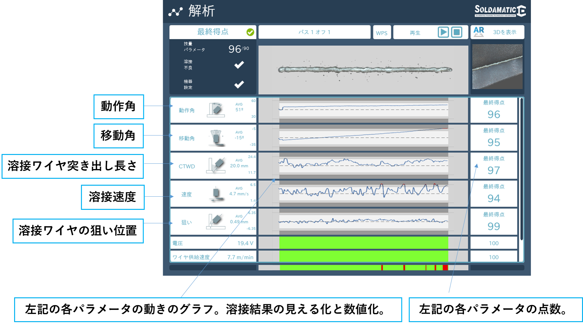 解析機能は、溶接技能訓練の結果を可視化、数値化するための機能です。この機能により、訓練生は、訓練直後にその結果と改善すべき点を確認することができるため、訓練効率が向上します。また、訓練結果を再生する機能を備えているため、結果を後から見て分析することもできます。これにより、指導者は、常に訓練生に付き添う必要がなくなるため、指導にかかる負荷が軽減します。