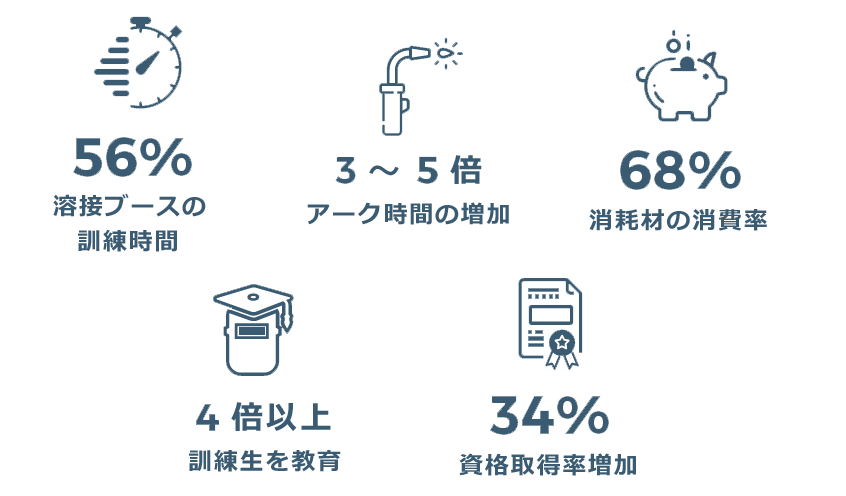 溶接技能訓練シミュレータを用いる訓練手法はあまり馴染みがないかもしれませんが、いくつかの方法論がこれまで研究されてきました。その一つとして、実際の溶接実習を行う前に、溶接の運棒方法を反復練習し、溶接姿勢を学ぶ手法が考案されています。この手法により、従来の溶接実習時間を削減しつつ、訓練効果を向上させることができると報告されています*。
