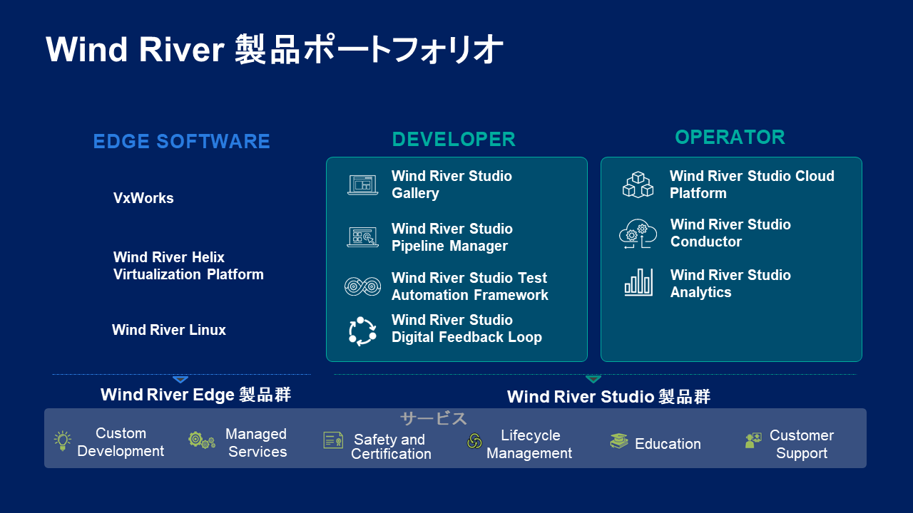 Wind River Studioは、セキュリティ、安全性、信頼性を必要とするミッションクリティカルなインテリジェントエッジシステムの開発、デプロイ、運用、サービスを行うための、クラウドネイティブプラットフォームです。