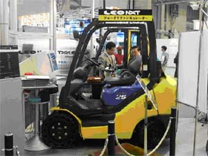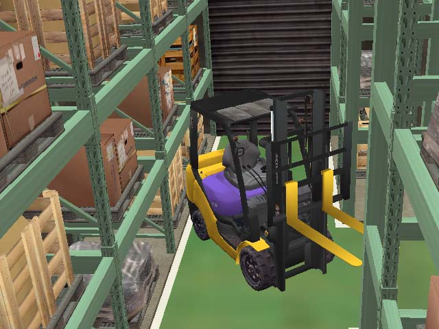 実物のフォークリフトの各種装置(アクセル・ブレーキ・ギア・フォークの昇降など)にセンサを取り付け、これらの情報をリアルタイムに対応しながら状況を模擬します。開発段階で実際に利用したフォークリフトのCADデータを採用し、標準車とコンパクト車を切り替えられるため、各車の特性の違いを体感できます。