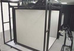 視覚環境シミュレータは、ATR(国際電気通信基礎技術研究所)人間情報科学研究所に構築された世界最小設置スペース型の4面没入表示システムです。Windows環境のPC4台をクラスタ化し、MDCで同期制御された円偏光の立体映像を、DLPプロジェクターにより高輝度で提示します。