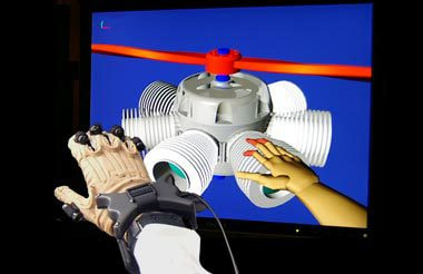 CyberGlove Systems社製のグローブセンサ(CyberGlove/CyberTouch)を使用すると、仮想空間内に自身の手のモデルを表示することができ、接触判定機能を利用し、部品に手が触れているかが分かります。またジェスチャ機能を使用することで、部品を持って移動させることが可能です。
